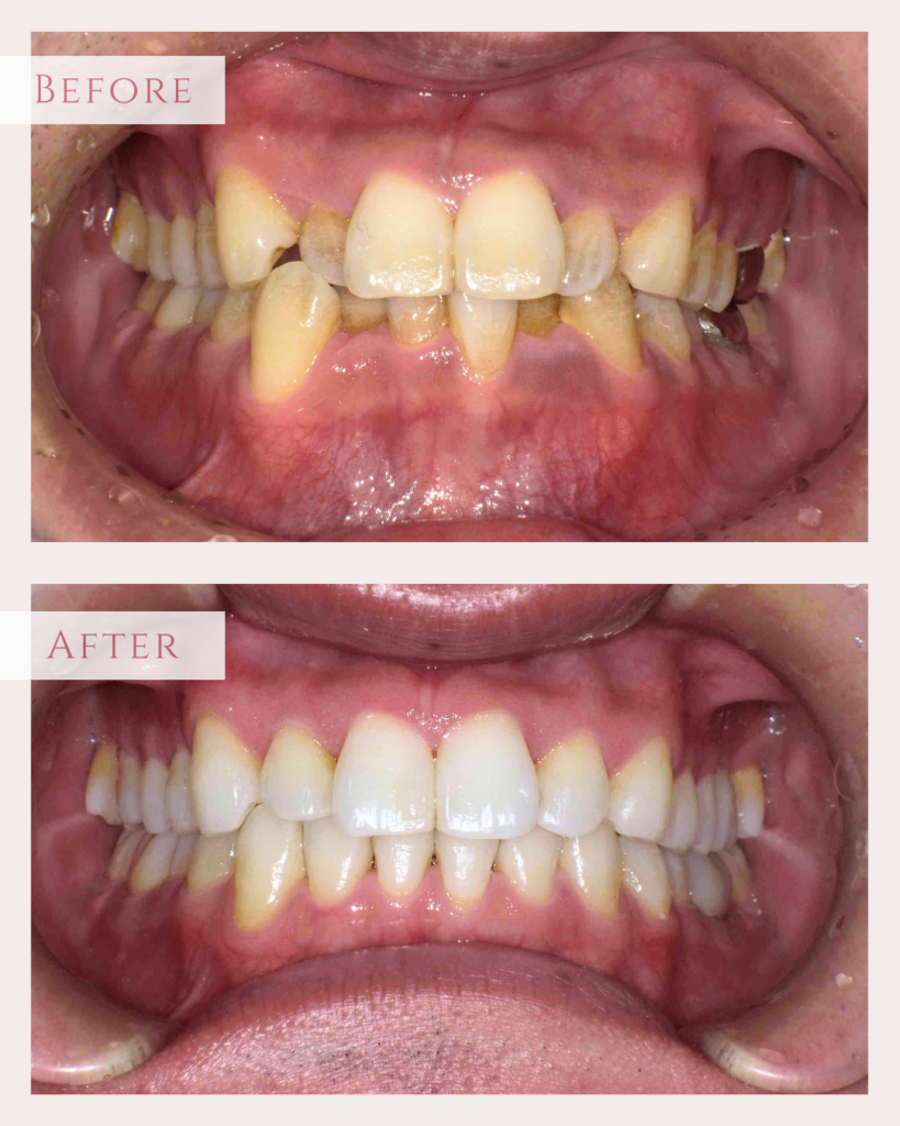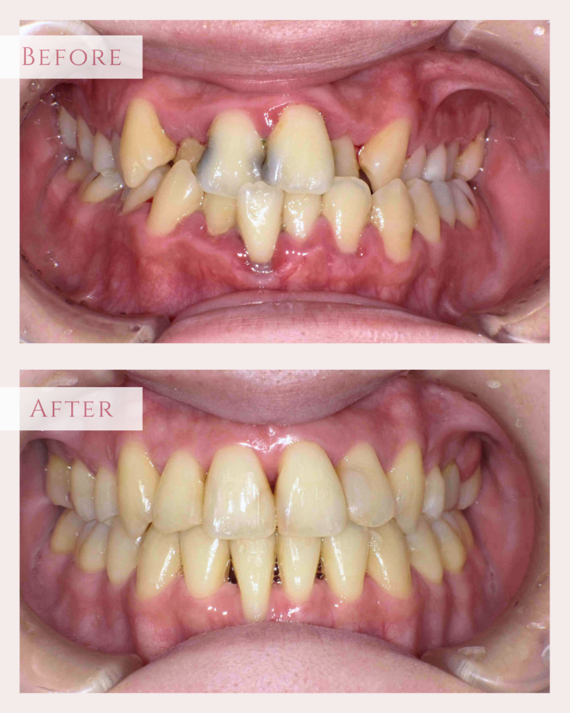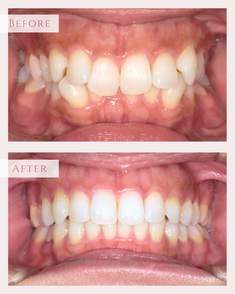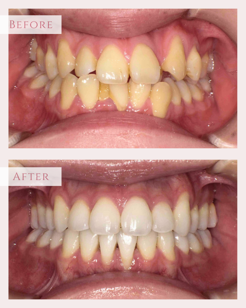 上下共に歯の大きさがやや大きく、それに対し歯並びの幅がやや小さいため不調和があり…